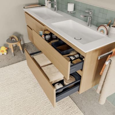 Im Familienbad stehen praktische Lösungen und Belastbarkeit im Vordergrund. derby V3 bietet großzügige Stauraumlösungen und pflegeleichte Oberflächen.