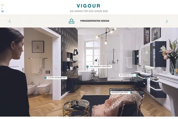 Das sogenannte Kubikfoto schafft interaktive Welten auf Basis von Fotos und damit ein multimediales Erlebnis. „Haute Couture für das Bad. Tauchen Sie ein“ steht auf der Startseite des Vigour-Internetauftritts – und mit einem Klick beginnt die Reise durch das Badezimmer.