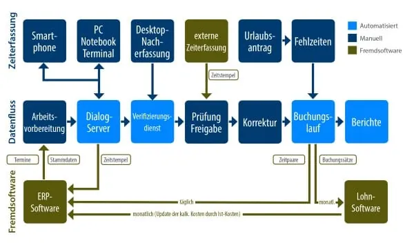 Täglich können die erfassten Daten für die Kostenrechnung an das ERP-System übergeben werden. Monatlich erfolgt eine automatisierte Aufbereitung für die Lohnabrechnung und Reisekostenabrechnung einschließlich aller betrieblichen Regelungen, beispielsweise Auslösung, Spesen, Fahrtkostenerstattungen, Übernachtungspauschalen und einschließlich der steuerlichen Bewertung. Die Ergebnisse werden an das Lohnprogramm übergeben.