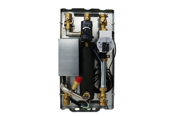 Dadurch wird der Installationsaufwand reduziert und Terminüberschneidungen zwischen Heizungshandwerk und Elektrofachbetrieb verhindert. Während der Heizungsbauer Hydraulikeinheit, Pumpen und Umschaltventile anschließt, muss der Elektriker lediglich die 400-Volt-Zuleitung bis zur Box führen und bleibt ebenfalls zeitlich flexibel. Ergänzend steht zudem eine Hydraulikstation mit integriertem Durchlauferhitzer zur Verfügung.