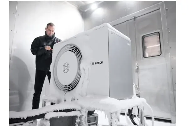 In der Kältekammer werden Wärmepumpen von Bosch geprüft. Bei Temperaturen deutlich unter dem Gefrierpunkt werden verschiedene Tests durchgeführt, um den Alltagsbetrieb bei kalten Witterungsverhältnissen zu simulieren. – © Bosch