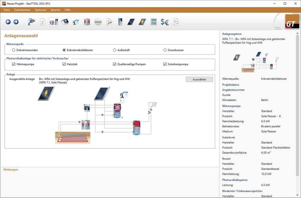 GeoT*SOL ist ein professionelles und benutzerfreundliches Werkzeug für die Planung und Auslegung von Wärmepumpenanlagen. Das Programm bietet Nutzern die Wahl, für einen Standort zwischen verschiedenen Wärmequellen, Betriebsweisen und zahlreichen Anlagenkonfigurationen zu wählen.