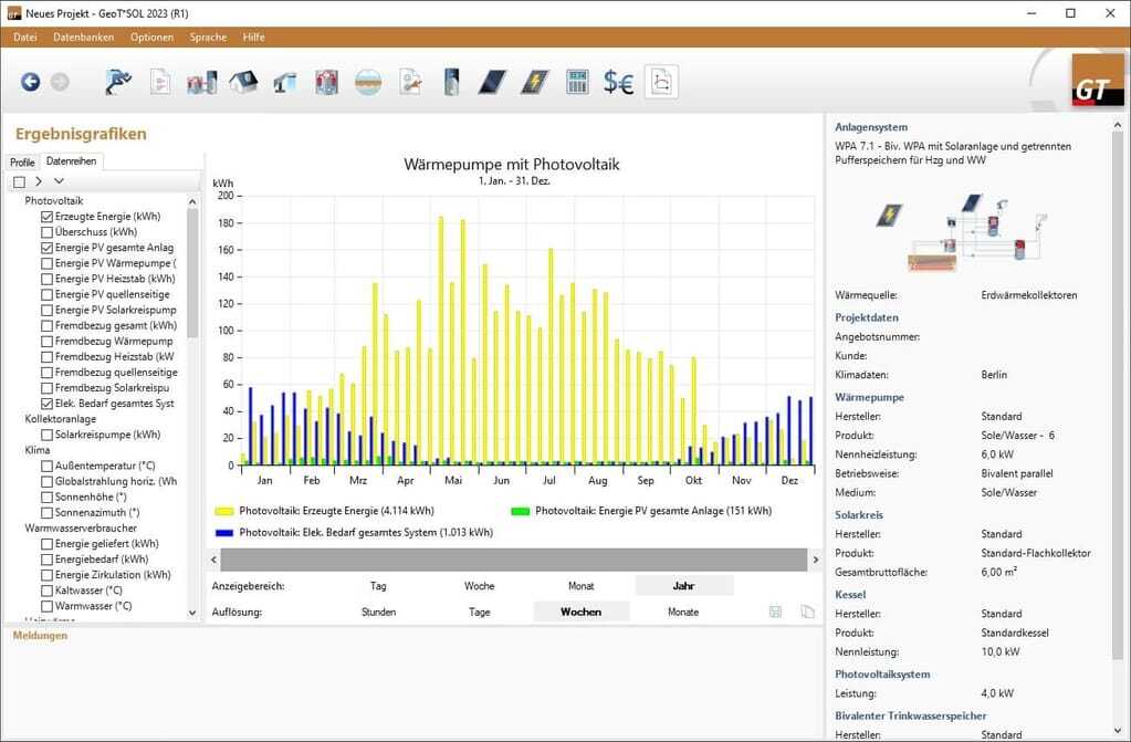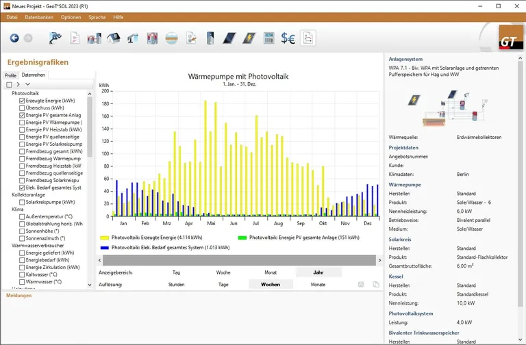 Die Simulation der Wärmepumpen- und PV-Anlage liefert zahlreiche Simulationsergebnisse (Datenreihen) auf Stundenbasis. In GeoT*SOL 2023 können diese jetzt als dynamische, konfigurierbare Diagramme im Programm angezeigt und ausgewertet werden. Die Diagramme lassen sich umfangreich konfigurieren: Vom Anzeigebereich (ein Tag bis ein Jahr) und der Auflösung (Stunden bis Monate) des Diagramms bis zu Farbe und Form (Balken, Linien, Punkte) der einzelnen Datenreihen. Die Konfigurationen können als Profil gespeichert und für weitere Projekte wiederverwendet werden. Ausgewählte Diagramme können übersichtlich in den Projektbericht für den Kunden integriert werden.