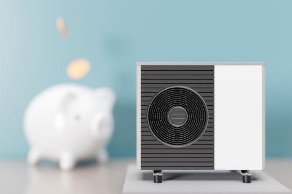 Symbolbild mit Wärmepumpe im Vordergrund, dahinter verschwommen ein weißes Sparschwein