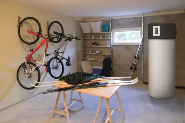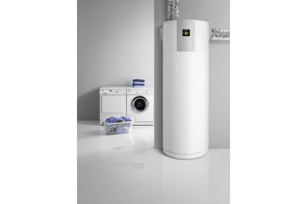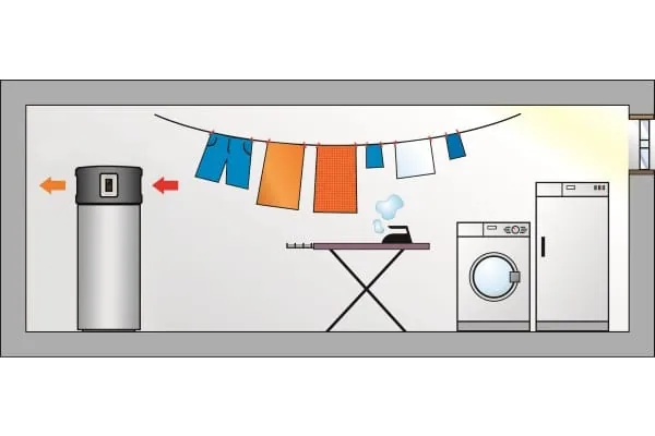 Eine Warmwasser-Wärmepumpe nutzt zum größten Teil Energie aus der Abwärme z.B. von Waschmaschine oder Trockner. Gleichzeitig wird der Raum klimatisiert, belüftet und entfeuchtet.