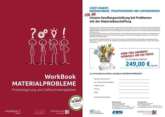 Gestiegene Preise und die Ungewissheit über Materiallieferungen machen es derzeit Handwerkern nicht einfacher, ihr Geschäft zu machen. Was kann bzw. muss ich bei bestehenden Aufträgen beachten und unternehmen, wenn die Preise weiter steigen, Material verspätet kommt oder überhaupt nicht mehr lieferbar ist? Das „WorkBook Materialprobleme“ gibt Handlungsempfehlungen.