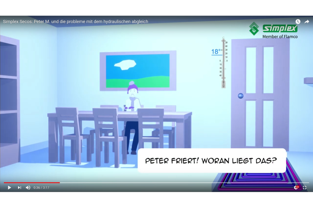 Die Simplex Armaturen & Systeme GmbH hat es deswegen in einem animierten Videoclip zum Thema gemacht und erklärt darin, welche Maßnahmen wirklich helfen, damit jede Wohnung die benötigte Wärme hat. Denn Behelfe wie eine Erhöhung der Pumpenleistung oder der Vorlauftemperatur verschlechtern die Anlagenhydraulik und lassen die Kosten steigen.