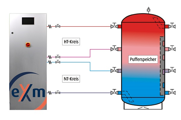 Der Einsatz einer Exergiemaschine eignet sich überall dort wo tiefe Rücklauftemperaturen gefordert sind (z. B. Fernwärme), Vorlauftemperaturen erhöht werden sollen (z. B. Wärmepumpe) oder auch im Warmwasserzirkulationsbetrieb.