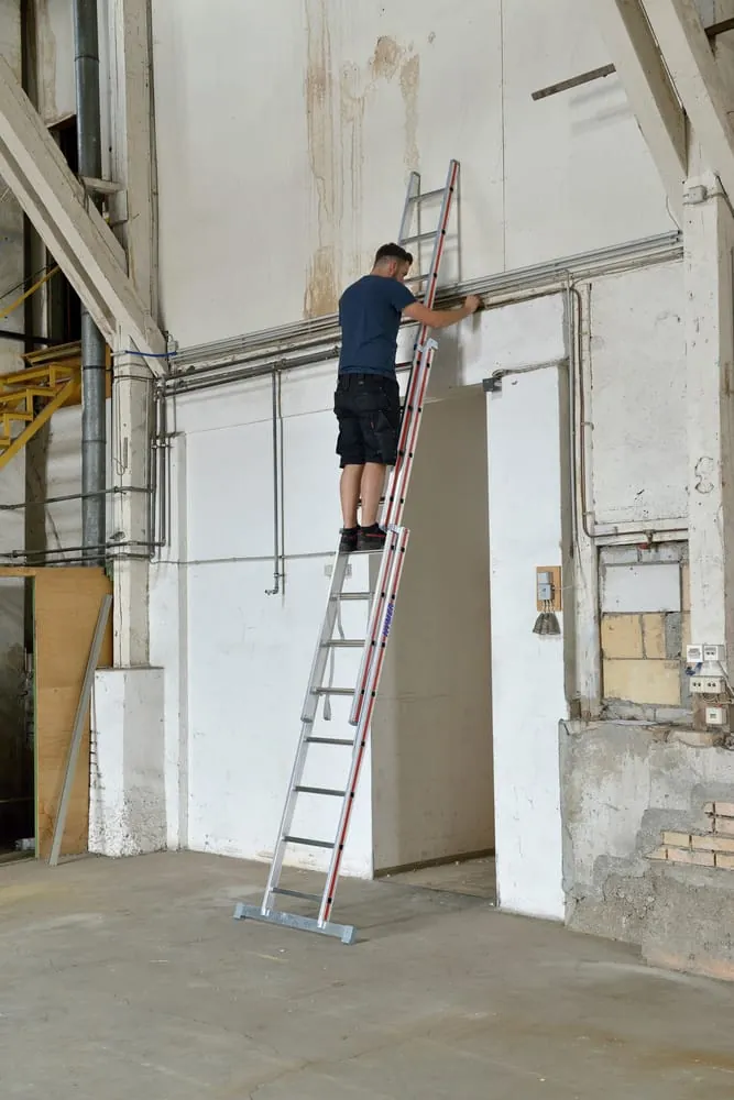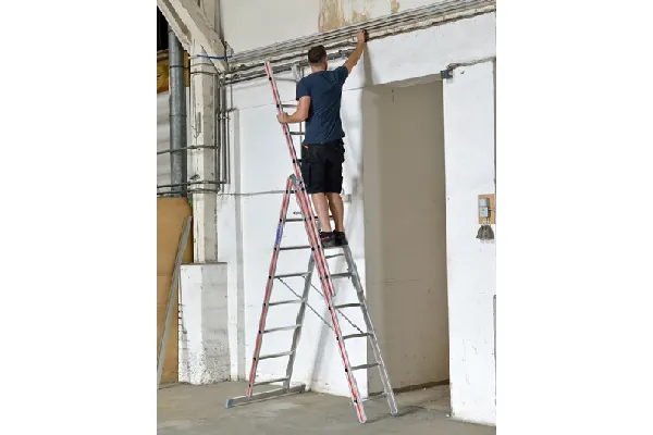 Die kombinierbare dreiteilige Mehrzweckleiter 4047 von Hymer-Leichtmetallbau kann als Stehleiter, als Anlegeleiter und bis zur Größe 3 x 10 Sprossen mit dem als Zubehör erhältlichen Klemmbeschlagset zusätzlich als Treppenstehleiter verwendet werden. Massive Stahlbeschläge, Sprossen aus Walzprofil und mit dem Holm verpresste Leiterfüße zeugen von der qualitativen Verarbeitung und machen die Leiter zu einer langlebigen Arbeitshilfe für verschiedenste Einsatzbereiche. Wie bei allen Produkten des süddeutschen Aluminiumexperten sorgen auch hier spezielle Komponenten für bestmögliche Anwendersicherheit: Eine starre Strebe verhindert ein unbeabsichtigtes Zusammenklappen der Leiter. Die stabile Traverse gewährleistet eine optimale Standsicherheit, so die Herstellerangaben.