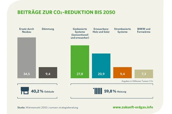 Die Studie „Wärmemarkt 2050: So erreicht Deutschland kosteneffizient das Klimaziel“ kommt zu dem Ergebnis, dass im steigenden Einsatz regenerativer Gase ein großer Hebel zum Erreichen des ehrgeizigen CO2-Reduktionsziels liegt. „Durch die Steigerung des Anteils auf 35 % bis zum Jahr 2050 sind 80 % weniger CO2-Emissionen im Gebäudesektor möglich“, schreiben die Autoren. Das CO2-intensive Heizöl werde im Wärmemarkt der Zukunft keine Rolle mehr spielen.