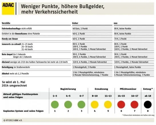 Die Führerscheinentzugsgrenze liegt dann bei acht Punkten, anstatt wie bisher bei 18 Punkten. Die Eintragungsgrenze steigt von 40 Euro auf 60 Euro. Pflichtseminare sowie die Verlängerung der Tilgungsfrist bei neuen Verstößen fallen weg. Zudem werden ausschließlich sicherheitsgefährdende Verstöße gespeichert. Die Möglichkeit, auch weiterhin Punkte durch ein freiwilliges Fahreignungsseminar abzubauen, ist dabei ein wichtiger Bestandteil. Das neue Rabattsystem ist zunächst auf fünf Jahre befristet, dürfte allerdings nach Einschätzung des ADAC als Dauerregelung zum Punkteabbau erhalten bleiben. Kritisch zu sehen sind die geplanten Verteuerungen im nächsten Bußgeldkatalog. Nach Ansicht des ADAC darf die Punktereform nicht dazu genutzt werden, das allgemeine Bußgeldniveau anzuheben. Schon heute ist geplant, den Wegfall der Punkte für Vergehen ohne Verkehrssicherheitsrelevanz durch höhere Geldbußen auszugleichen. So verdoppelt sich beispielsweise die Strafe für das Einfahren in eine Umweltzone von 40 auf 80 Euro. Weitere Änderungen in 2014 Im Zusammenhang mit dem neuen Punktsystem gibt es zum 1. Mai auch Änderungen im Bußgeldkatalog. Das Benutzen des Mobiltelefons während der Fahrt, das Fahren ohne Begleitung bei unter 18-Jährigen, aber auch die Nutzung von Sommerreifen bei Eis und Schnee oder die Missachtung des polizeilichen Haltegebots werden teurer. Ab Juli 2014 gilt auch hierzulande die Warnwestenpflicht. Dann muss in jedem Fahrzeug eine Warnweste (Europäische Norm EN 471) vorhanden sein. Durch eine Reform der MPU (medizin-psychologische Untersuchung) sollen die Verfahren der Untersuchung transparenter und einheitlicher gemacht werden.