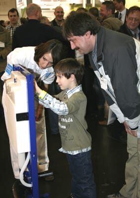 Weniger Montage, mehr Design. Das war das Motto für Geberit auf der SHK Essen 2008. Auf großes Interesse stieß der neue Geberit Unterputzspülkasten UP-320. Alles, was der Fachhandwerker zur Installation des neuen Unterputzspülkastens nur noch braucht, sind die Werkzeuge, mit denen er auf die Welt gekommen ist: seine Hände, betonte Martin Doerr, Leiter Technik. Einmal an der Wand befestigt, benötigt die Montage und die Wartung des UP-320 keine Werkzeuge mehr. Die neuen Duofix Installations-Elemente für Wand-WC werden ebenso wie Sanbloc-, Kombifix- und GIS-Elemente mit dem neuen Unterputzspülkasten ausgeliefert. Wie einfach und schnell die Montage ist, zeigte ein Wettbewerb am Stand von Geberit, bei dem es täglich ein Fahrsicherheitstraining zu gewinnen gab. Die Gesamt-Bestzeit lag bei 17 Sekunden. Übrigens: Vom 16. bis 19. April gibt es die Neuheiten auch auf der IFH in Nürnberg zu sehen.