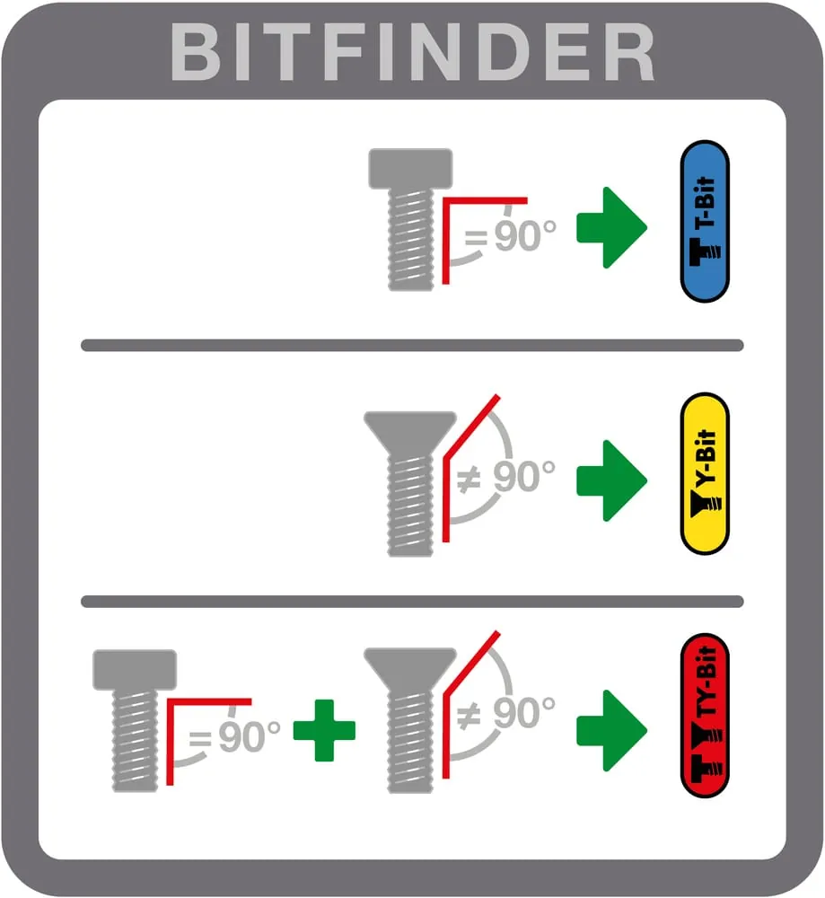 Einfaches Konzept, einfache Anleitung: Hat man Schrauben mit 90 Grad-Winkel am Schraubenkopf, die eher flach auf dem Material aufliegen, sind die neuen blauen T-Bits zu wählen. Bei Schrauben mit Winkeln über 90 Grad, also eher Senkkopf-mäßiger Form, sind die gelben Y-Bits die richtige Wahl. Möchte man beide Schraubenvarianten verschrauben, sind die roten Generalisten, die TY-Bits, die Richtigen. Die Frage ob man manuell oder mit Impact-Schrauber arbeitet stellt sich erst gar nicht.
