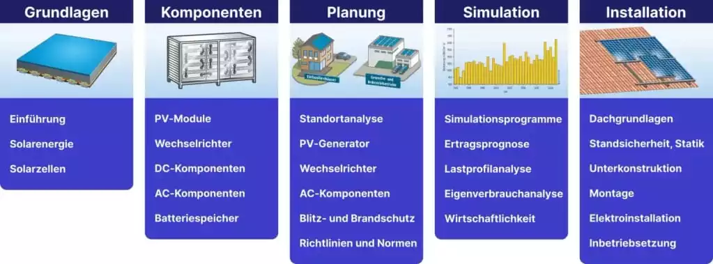 Zum Start liegt der inhaltliche Fokus der Wissensplattform auf den Themengebieten Grundlagen, Komponenten und Planung. In den nächsten Monaten wird pv-wissen.de sukzessive erweitert, unter anderem um Inhalte zur Montage und Elektroinstallation von PV-Anlagen sowie um weitere praxisrelevante Themengebiete.