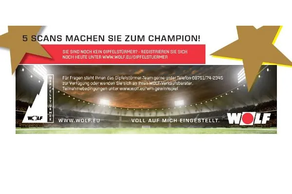Die Wolf GmbH verlost im Rahmen ihrer „Gipfelstürmer-WM-Aktion“ drei Fernseher Panasonic 65 Zoll UHD unter allen am Gipfelstürmer-Bonusprogramm teilnehmenden Partnern.