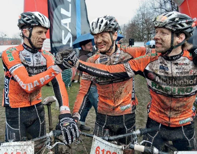 Klaus Reinisch (li.) freut sich mit seinen Teamkollegen über einen erfolgreichen Kyffhäuser-Marathon.
