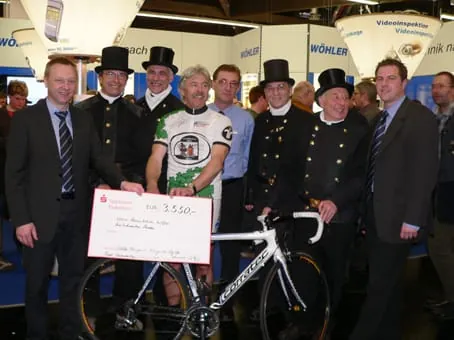 Auf der IFH in Nürnberg überreichte Wöhler einen Scheck über 3.550 Euro an den Verein ?Kaminkehrer helfen krebskranken Kindern?.