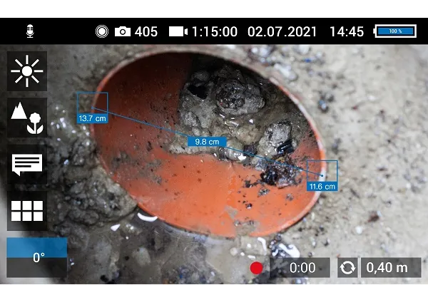 Mit einer weiteren Funktion lassen sich Strecken im Blickfeld der Kamera ausmessen, so dass der Anwender Durchmesser und Abstände der inspizierten Objekte gut einschätzen kann. Die beiden Endpunkte der zu messenden Strecke legt er durch Tippen in den Bildschirm fest. Die Kamera blendet dann die Distanz zwischen den beiden Messpunkten innerhalb von 2 Sekunden ein. Nach der Messung kennt der Anwender die Rohrdimension und kann so z. B. bei T-Stücken leicht beurteilen, um welchen Abgang es sich handelt. Misst er bei einer Rohrverstopfung den Rohrquerschnitt und die Dimension der Verstopfung, so weiß er genau, welches Werkzeug er zur Beseitigung einsetzen muss.