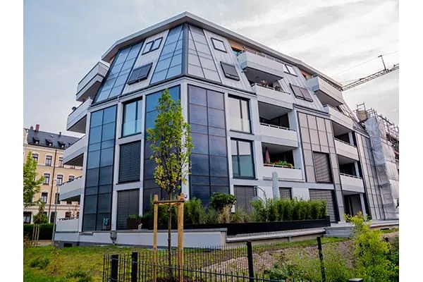 Bei der zweiteiligen Eigentumswohnanlage in Chemnitz handelt es sich um ein Sonnenhaus mit einer modernen, futuristisch anmutenden Solararchitektur.