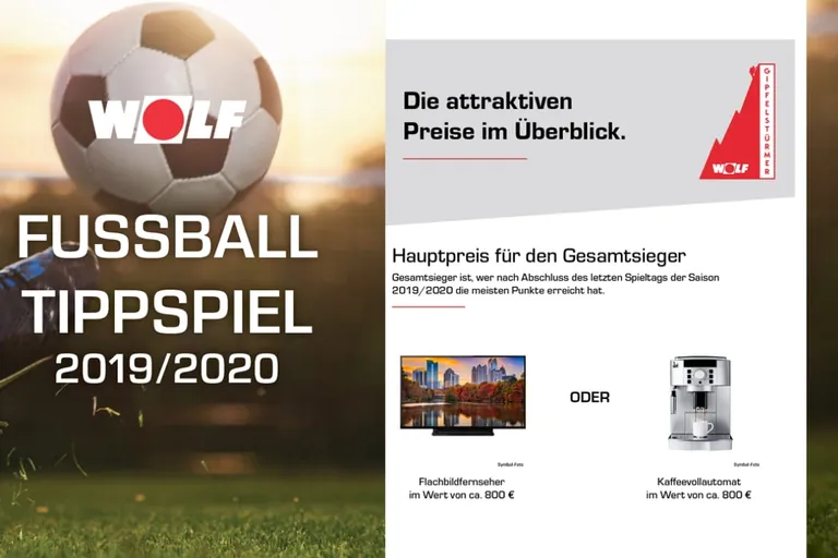 Zur neuen Fußball-Saison 2019/2020 veranstaltet Wolf erneut ein Online-Fußball-Tippspiel. Alle Nutzer des Wolf-Profi-Portals – wie beispielsweise Mitarbeiter von SHK-Fachbetrieben – können mitspielen und in einem Teamranking ihre Kollegen herausfordern.
