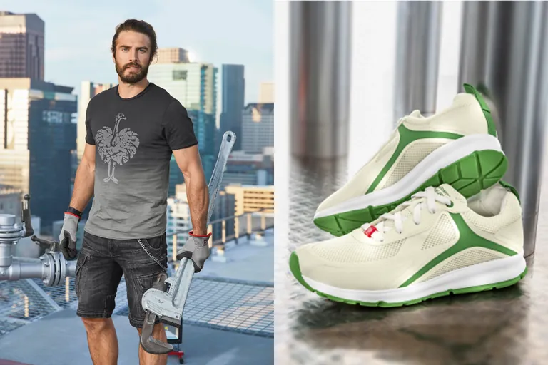 Die Modelle sehen auf den ersten Blick nicht nach Arbeit aus, sind aber funktional: lässige Jeans als extra robuste Workwear und Arbeitsschuhe in den Schutzklassen S1 und O1, die wie Freizeit-Sneaker aussehen.