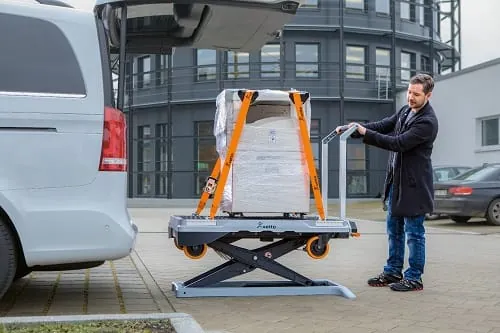 Heben und Senken ohne Muskelkraft und ohne in die Knie zu gehen: Mit Hilfe der oberen Bedieneinheit am Schiebegriff lässt sich die Ladefläche hoch- bzw. herunterfahren ohne in die Knie zu gehen. Somit ist rückenschonendes, aufrechtes Arbeiten möglich.