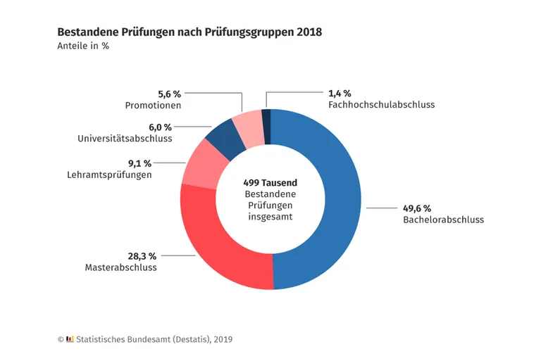Jedes zweite Examen (247.200) führte im Prüfungsjahr 2018 zu einem Bachelorabschluss (ohne Lehramt). Im Vergleich zum Vorjahr sank die Zahl der Bachelorabschlüsse leicht um 2 %. Einen Rückgang gab es zudem bei den Promotionen (-2 % auf 27.900), den herkömmlichen universitären Abschlüssen (-7 % auf 30.000) und den herkömmlichen Fachhochschulabschlüssen (-12 % auf 7.200). Dagegen erhöhte sich die Zahl der Masterabschlüsse (141.000) und der Lehramtsprüfungen (45.500) gegenüber dem Prüfungsjahr 2017 jeweils um 3 %.