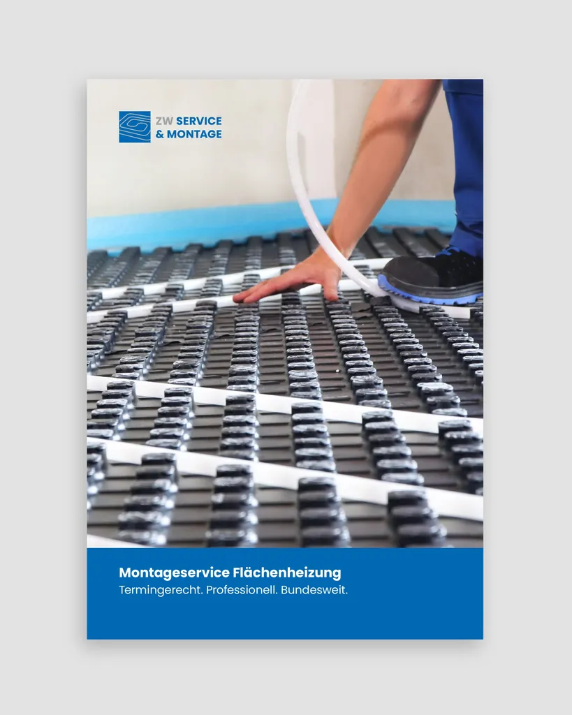 Die FBH-Heizlastberechnung (nach DIN EN 12831) wird inkl. Heizflächenauslegung (nach DIN EN 1264) angeboten. Auch Zeichnungen von Verlegeplänen können bestellt werden. Für die Montage und den Anschluss von Flächenheiz und -kühlungen stellt das Serviceunternehmen die Zewotherm-Systeme Tacker-, Noppe-, Klett- und Trockenbau zur Auswahl. Auf Wunsch bringen die Monteure auch die Heizkreise der Zewo Industriebodenheizung (20 x 2,0 mm oder 25 x 2,3 mm) mittels Bindedrahtmaschine auf bereits vorhandenen Baustahlmatten ein. Vorbereitende Arbeiten wie das Nivellieren oder die Verlegung von PE-Folie als Trennlage können außerdem gebucht werden. Die Montage des Heizrohrs, der Anschluss an die Verteiler und die Beschriftung der Heizkreisverteiler mit Raumkennung und Heizkreisnummer gehören zum klassischen Serviceangebot. Die abschließende Prüfung der Installation mit Prüfprotokoll und Garantieerklärung sind ebenfalls Bestandteil des Leistungskatalogs.
