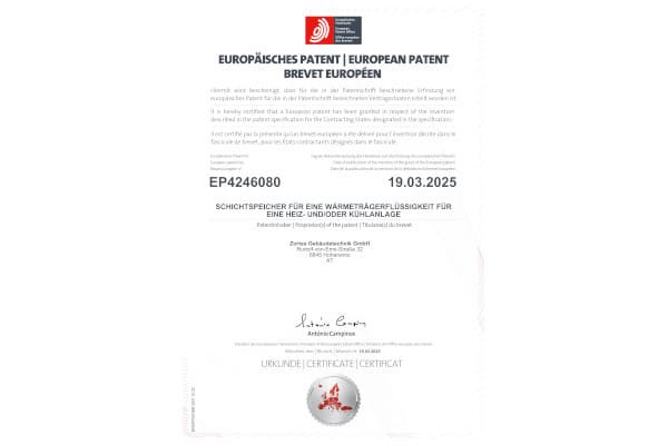 Um auch unter diesen Bedingungen eine hocheffiziente und saubere Schichtung bei der Pufferung zu erzielen, entwickelte Zortea ein neues, adaptiertes Schichtungsverfahren für die Vorhaltung von niedrigen Temperaturniveaus. Die Effektivität der optimierten Speichertechnik wurde mit einem neuen europäischen Patent bestätigt. Damit verfügt Zortea derzeit über insgesamt 18 rechtskräftig erteilte Patente.