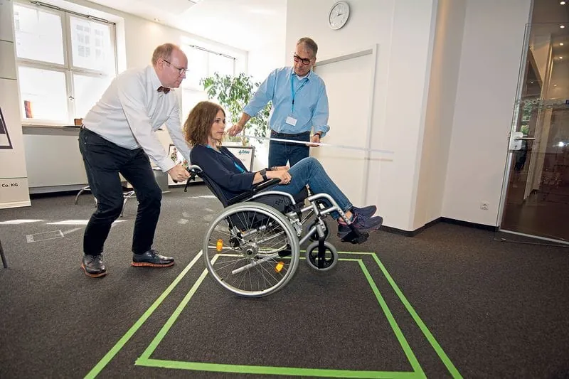 Teilt sich der Rollstuhlfahrer die zur Verfügung stehende Fläche mit seiner Pflegekraft, wird es erst recht eng – für beide. „Wenn wir als Pflegekräfte allerdings nicht mitduschen und nass werden möchten, sind diese Maße illusorisch. Anstatt einer quadratischen Duschfläche, wie sie die Norm vorschreibt, wäre eine rechteckige Fläche von 180 x 110 cm viel sinnvoller“, sagt Doris Liebe, Pflegedienstleiterin aus Aalen.