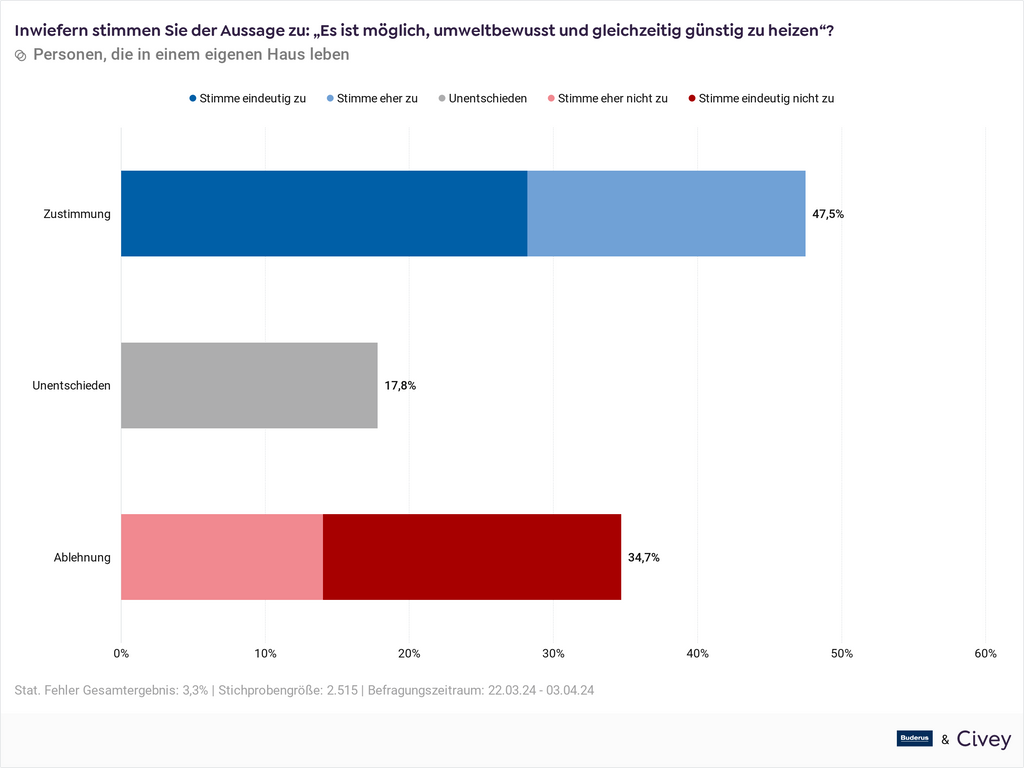 Dass umweltbewusst und gleichzeitig günstig geheizt werden kann, hält knapp die Hälfte der Befragten für möglich. Gut ein Drittel stimmen dem nicht zu. – © Civey für Buderus