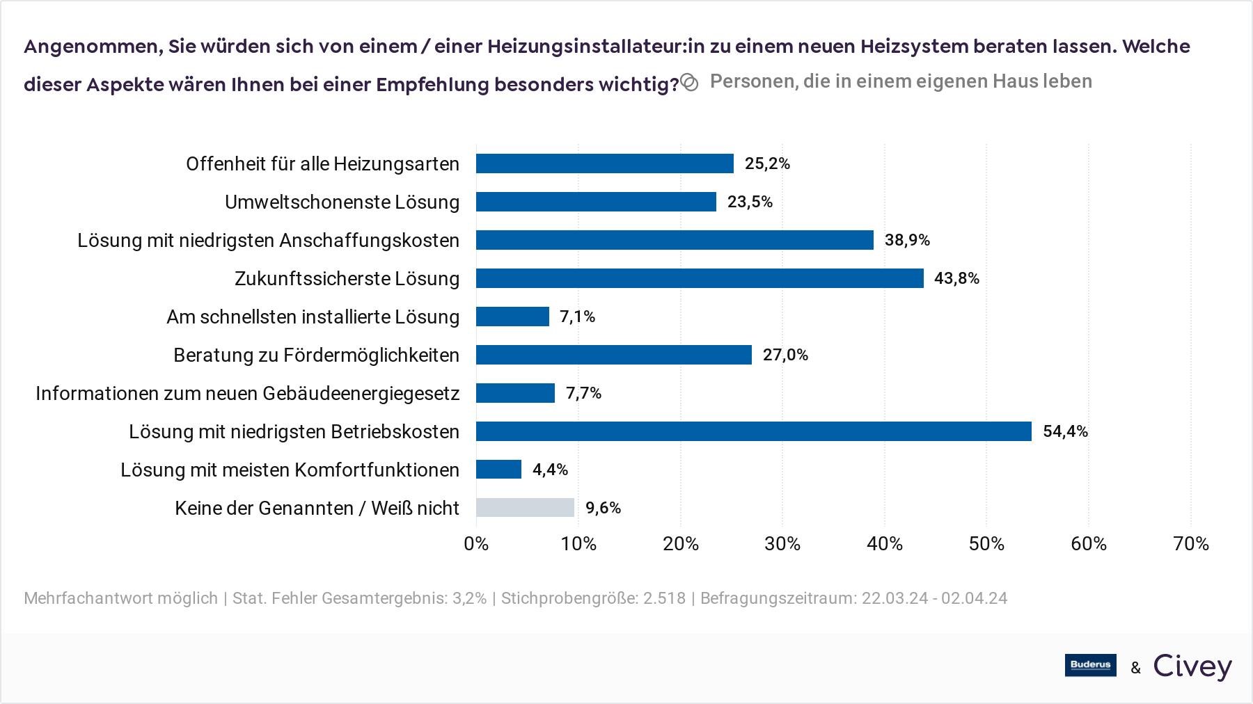 Bild 6: Wichtig bei einer Beratung von Endkunden sind zukunftssichere Lösungen mit niedrigen Energiekosten. Denn diese beiden Punkte sind den Befragten am wichtigsten. – © Civey für Buderus