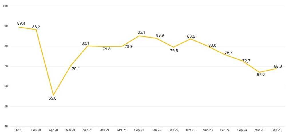 Die Entwicklung des Geschäftsklimaindexes (GKI) in den letzten sechs Jahren. Dabei stieg der GKI zwischen Frühjahr und Herbst 2025 wieder leicht an – von 67 auf 68,8 Punkte. – © ZVEH