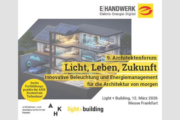 Unter dem Motto „Licht, Leben, Zukunft – innovative Beleuchtung und Energiemanagement für die Architektur von morgen“ lädt der ZVEH am 12. März 2026 auf die Fachmesse Light + Building zum 9. Architektenforum ein.