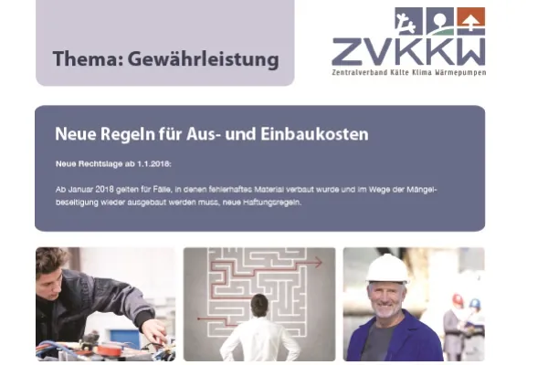 Der Zentralverband Kälte Klima Wärmepumpen (ZVKKW) hat eine Informationsbroschüre über die neuen Haftungsregeln veröffentlicht, die seit Jahresanfang für Fälle gelten, in denen fehlerhaftes Material verbaut wurde und im Wege der Mängelbeseitigung wieder ausgebaut werden muss.