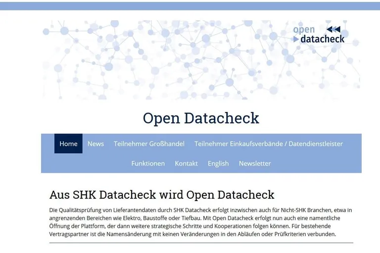 Der Zentralverband Sanitär Heizung Klima (ZVSHK) und der Deutsche Großhandelsverband Haustechnik (DG Haustechnik) haben im Februar eine Kooperationsvereinbarung zur verbesserten Qualitätsprüfung von Lieferantendaten unterschrieben. Aus dem ursprünglich vom Großhandel betriebenen „SHK-Datacheck“ wird jetzt „Open Datacheck“ unter Anbindung eines ZVSHK-Datenservers.