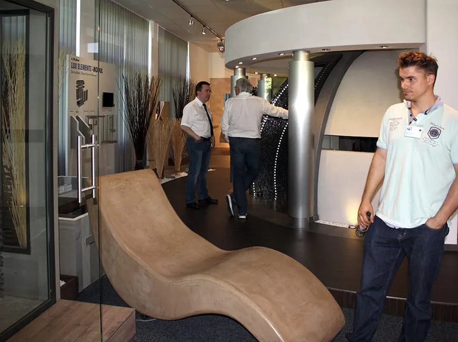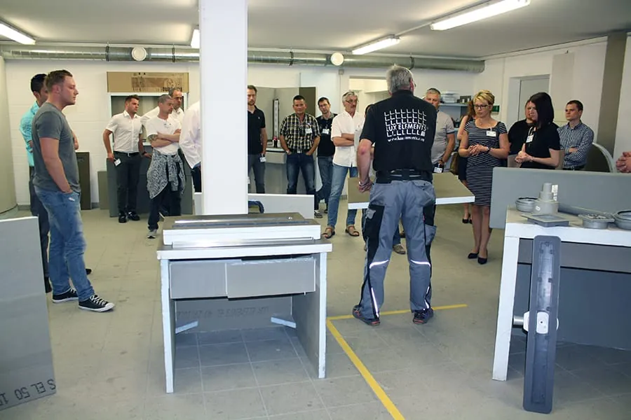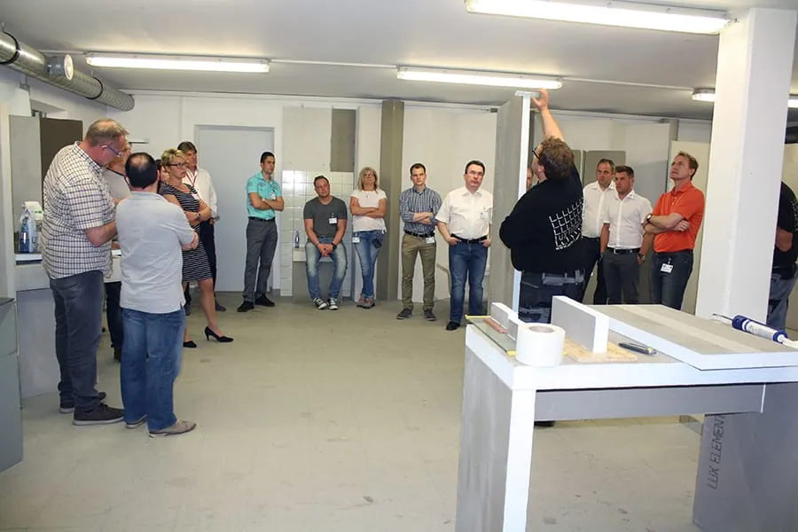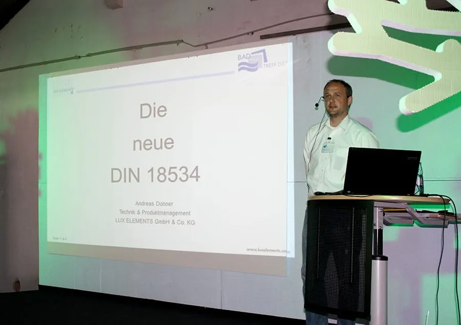 Nach der Mittagspause wartete der nächste Tagespunkt. Das zunächst trocken klingende Thema „Neue Stoffe DIN1834“ wurde von Lux Elements Anwendungstechniker Andreas Donner unterhaltsam und informativ vorgetragen. Die neue Norm wurde genauestens und auch kritisch unter die Lupe genommen bevor sich die Teilnehmer zum zweiten Praxisteil wieder ins Schulungszentrum begaben. Hier wurde unter anderem der schnelle Aufbau einer Badnische mit Dusche und Wanne im Zeitraffermodus vorgeführt.