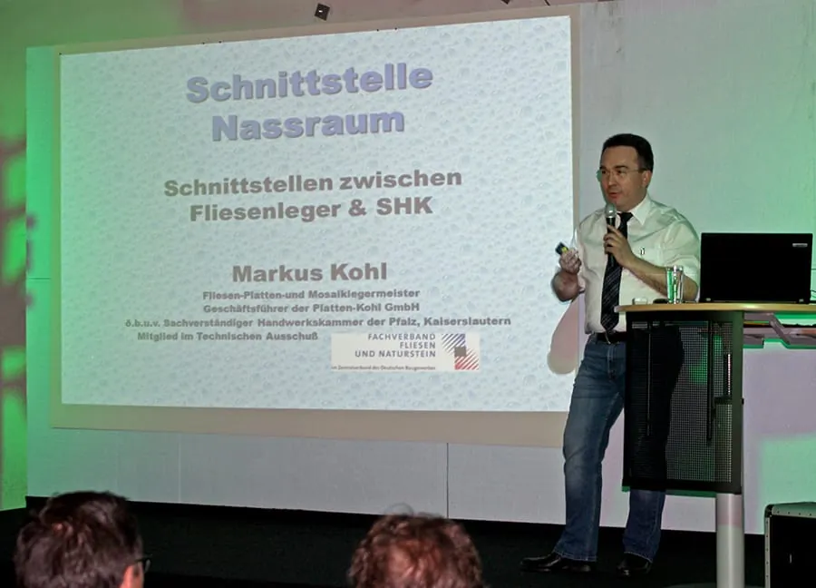 Sein Vortrag „Schnittstellenprobleme zwischen Installateur- und Heizungsbauerhandwerk und Fliesen-, Platten- und Mosaiklegerhandwerk“ traf genau den Nerv der Zuhörer. Ein wichtiger Aspekt war das Thema „Abdichtung“. Bereits die Einleitung ließ die Zuhörer staunen: Markus Kohl zitierte die Bibel, in der die erste Abdichtung der Menschheit erwähnt wurde: beim Bau der Arche Noah.
