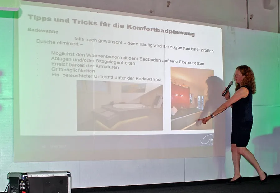 Zum Ende des Veranstaltungstages referierte Andrea Stark zum Ende des Veranstaltungstages über das Komfortbad von morgen. Die selbständige Innenarchitektin, staatlich geprüfte Betriebswirtin und Buchautorin verfügt über 25 Jahre Erfahrung im Bäderbau. Zusätzlich führt sie Seminare zur Gestaltung durch und schreibt Fachartikel.
